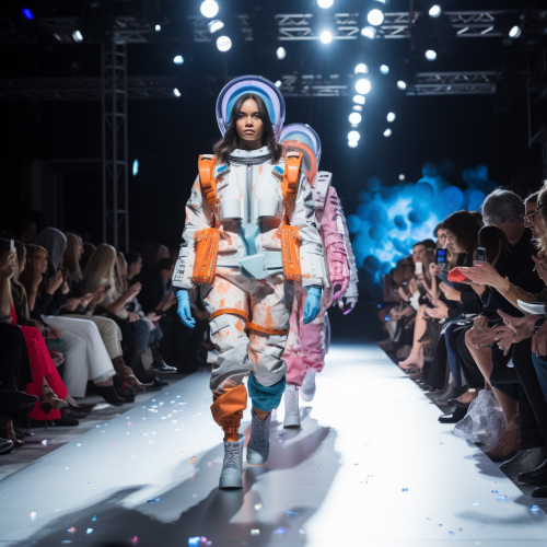 Fashion show in which models wearing space suits and space clothing walk the runway