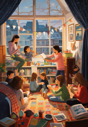 illustration of a Christmas stocking with three children at the base of the Christmas tree and their parents together in the background. There is a guitar on the Christmas tree.Cross stitch style, very simple