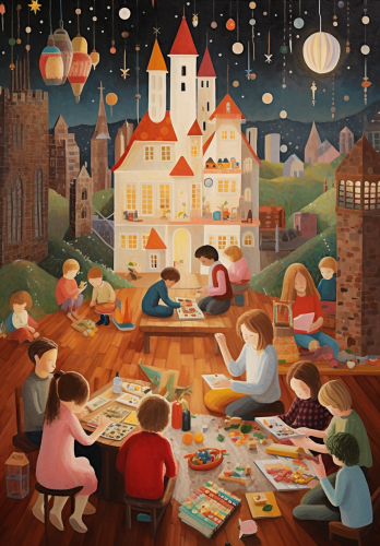 Christmas themed guitar family Christmas illustration reference for stocking with three children ,two with long hair and one with short brown hair ,at the base of the Christmas tree with a man and a woman standing together in the background. Cross stitch style