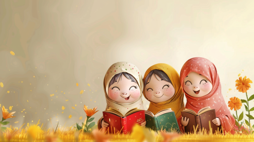 islamic kids with book, cartoon, ramadan background only, theme pretty, golden color, Allie Brosh style --s 250 --ar 16:9 --v 6.0