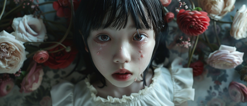 Create a live-action photograph featuring a young boy and girl standing together in a dark, mysterious forest with large, twisted tree roots in the background. The boy is wearing a yellow cap, a white shirt with rolled-up sleeves, and a brown vest. A close-up live-action photograph of a young boy and girl holding hands. The boy’s arm is visible, wearing a white rolled-up sleeve, and his hand is gently clasping the girl’s hand. The girl is wearing a light pink puff-sleeve dress with a blue belt, and a red headband in her short hair. The scene should show slight dirt marks and scratches on their hands and arms, suggesting they’ve been through a challenging journey. The overall lighting is soft, capturing the emotional bond between the two characters. The girl is dressed in a light purple blouse with puffed sleeves, a red belt, and a red headband. She looks concerned but resolute. Both of them have slightly dirty clothing and minor scratches on their faces, as if they’ve been through a challenging journey. --v 5.1