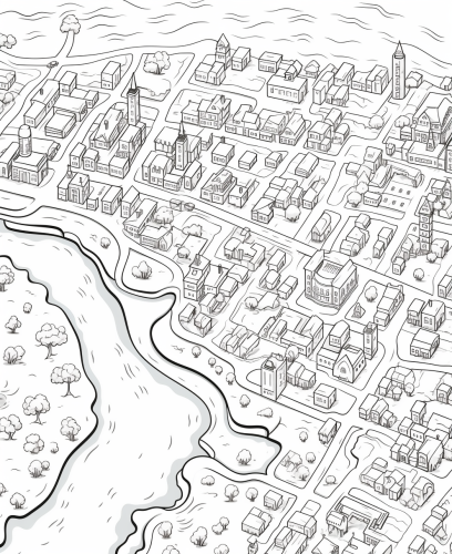 coloring book for kids, map, black and white, white background, 2D, flat design, cartoon style, minimalist style, low detail, no shading --ar 9:11