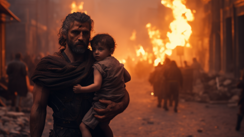 a photographic composition of a special police officier carrying a very old lady on his shoulders in the streets. The police officer has a full black strapped uniform with a helmet, and a very serious expression. The grandma has a pink dress. She is lauging loud. We see them from the 3/4 side. raw style --ar 9:16 --v 6.0