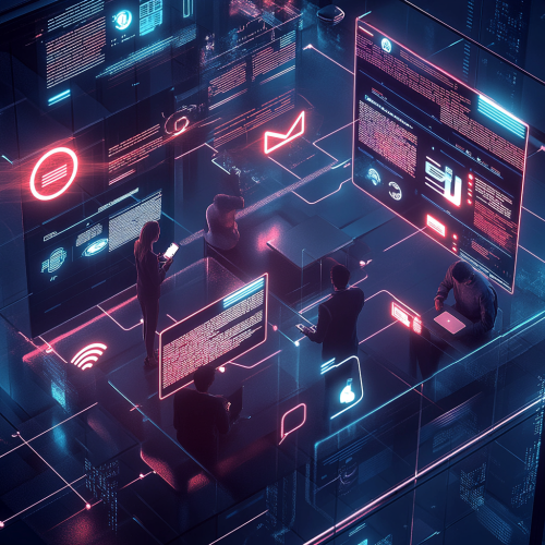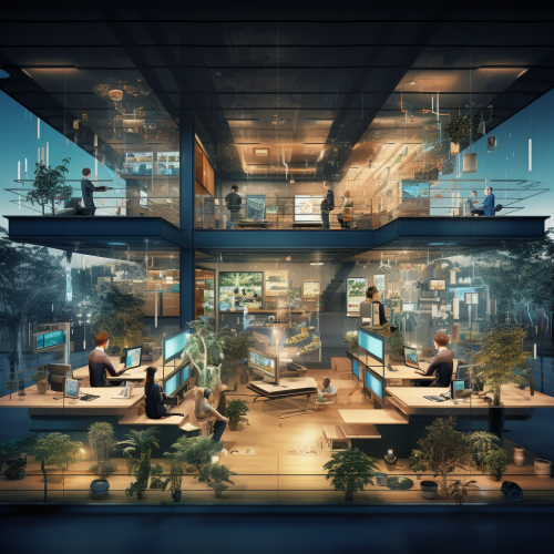 An architecture office with humans working in collaboration with Artificial intelligence forms, The eletric state style