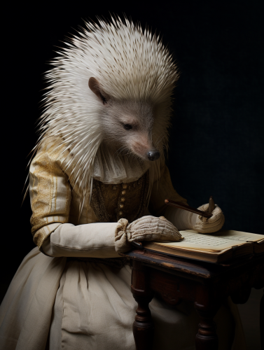 african porcupine, quill in paw, writing poetry with her own quill, clair obsure, portrait by erwin olaf --ar 3:4
