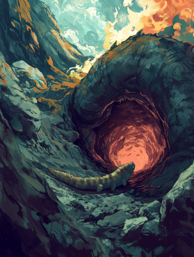 a magic the gathering wurm that has claws for digging, in a volcano, in the style of Western Animation, soft colors, simple anime, --v 6.0 --ar 3:4