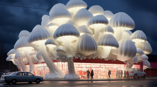 Jumbo supermarket building with giant mushrooms coming out of the building, hyper realistic, shot by Erwin Olaf, high detail, bright, outside lighting, --ar 16:9