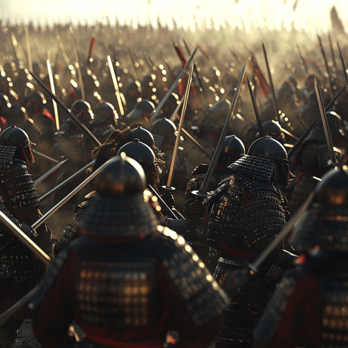 a large samurai army, standing against the Mongol invasions of the 13th century, swords flashing in the chaos of battle, iconic armor glinting in the sunlight. Hyper realistic. Photographic. UHD. Dramatic imagery. High contrast. Action shot. Candid 8K