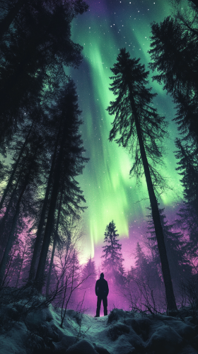 A breathtaking natural landscape featuring a dense forest illuminated by the vibrant colors of the northern lights. An adventurer stands among the tall trees, gazing up at the shimmering auroras that dance across the night sky. The forest floor is covered in snow, reflecting the green and purple hues of the auroras. The overall atmosphere is magical and awe-inspiring, capturing the ethereal beauty of the northern lights, natural lighting, in elusive, professional colour grading --style raw --ar 9:16