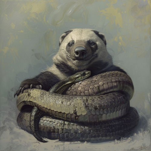 a happy honey badger is drunk but happy, with eyes closed. it is lying down and a king cobra is coiled around the honey badger, with the cobra's head sticking out somewhere and looking at the badger as if it is the most delicious dinner. minimalist and clean background, painted by rene margritte, surrealism