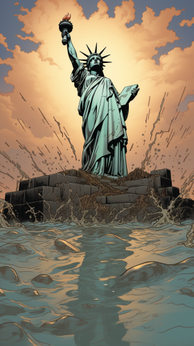 staty of liberty drowned. Skyskrapers sticking up in the water. Comic book cover by Jack Kirby --ar 9:16 --s 250