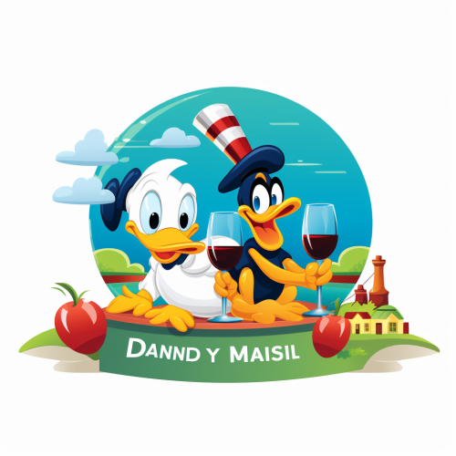 disney food and wine festival logo; cute cartoons; donald duck, goofy, and daisy drinking wine and eating small plates of food.