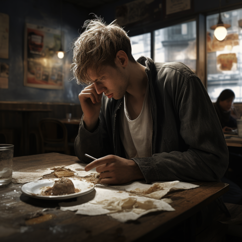 ultra realistic, image of Someone eating dull food in a dirty old cafe