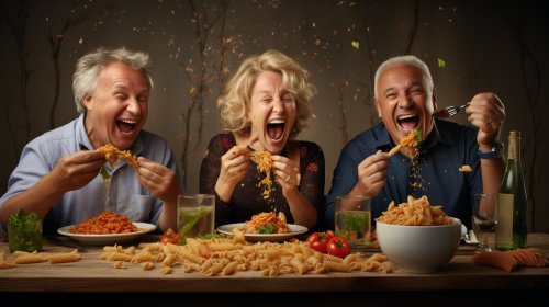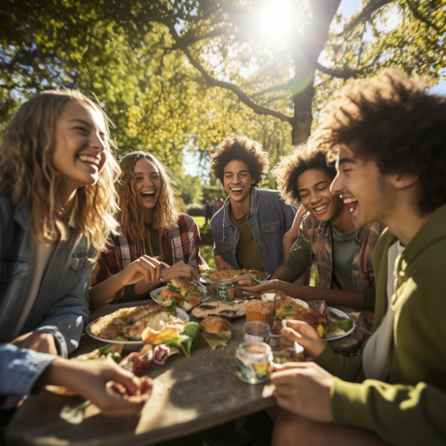 a high quality photograph of a happy group of teenagers sitting around a table in a park eating nutritious food