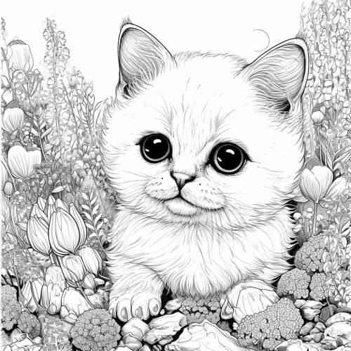 coloring page, crisp lines,white background, a mandala capturing the playful movement of kittens with spinning toys, ar 17:22, 1 bit graphic, simplified