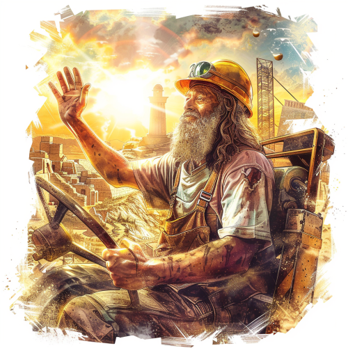 hippy looking jesus with construction hat on driving a crane and waving with one arm out of the window, beautiful ancient kingdom and sun shining in the background, highly detailed t-shirt design, white transparent background