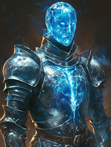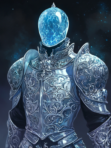 A stylized dungeons and dragons character portrait in the style of Capcom's Breath of Fire concept art: a glistening blue plasmoid figure with no face in an ornate shining suit of silver knight's armor --ar 3:4