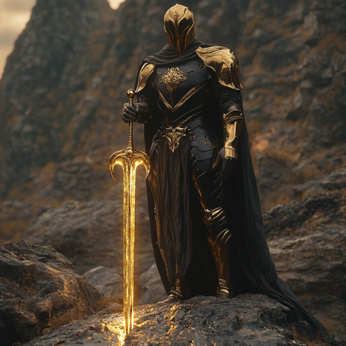 A knight in golden-black armor and cloak looking like Sauron from Lord of the Rings holding with both hands a golden sword that is impaled on a rock, golden lightultra realistic, High resolution, realism 4k --v 6.0