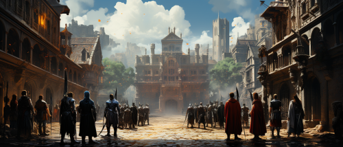 knights training in castle yard, combat, armor, swords, scene, sunny, atmospheric, bright colors, dynamic poses, group shot, multiple people, castle, medieval, fantasy, 5e, D&D, dungeons & dragons, in the style of the player's handbook --ar 21:9 --s 750
