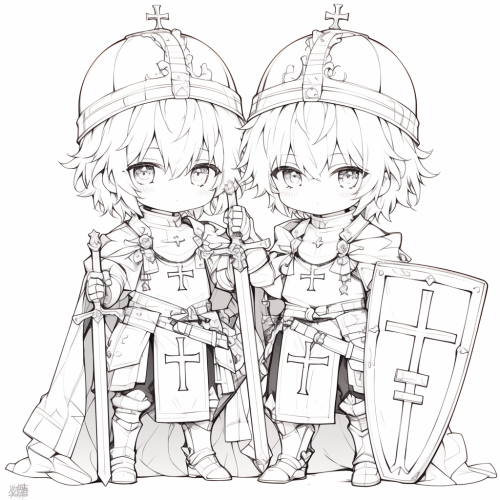 outline The Knights Templar are waifus, two twins waifu knights vary, black ink on white paper, no color, full body, Chibi anime Catholic, --style raw --s 750 --niji 6