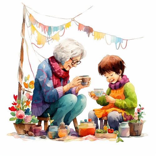 european child and old lady short hair knitting colorfull threads, sustainable fair, tents, spring , illustration, ::1000 cartoon