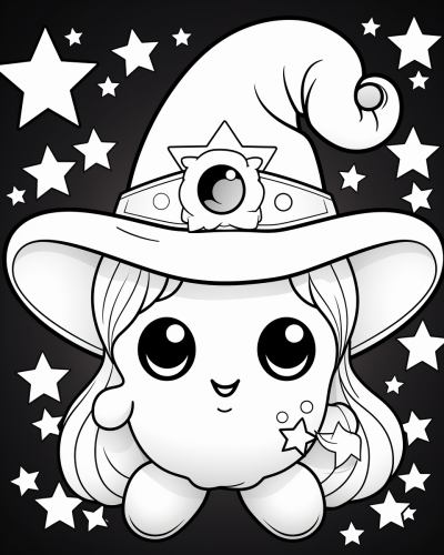 kawaii-style Halloween coloring book, A friendly moon stars, black and white only, no shading, bold simple lines, white background --ar 8:10