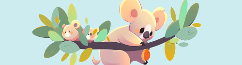 Koala, koala playing, rich picture, flat illustration --ar 359:96 --niji 5 --style expressive