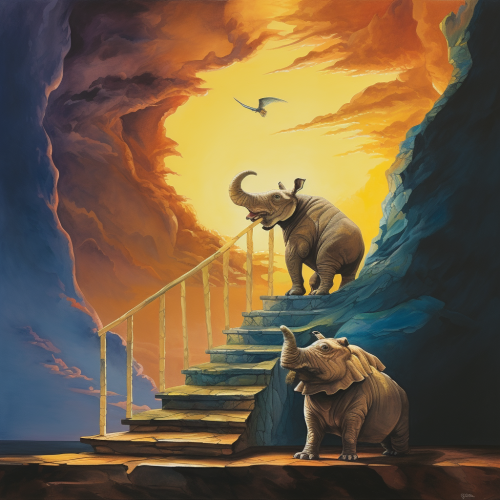 a Koala and a Rhino, best friends, climbing the stairs, Salvador Dali's painting, vintage color, Surreal, night, melting, poster