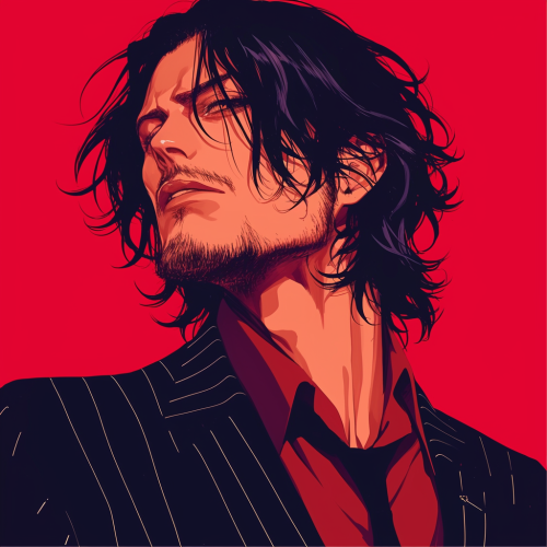 full body portrait of Diego Luna in all black pin-striped Zoot suit, facing the camera, looking forward at the camera, in the style of anime. The style of BLEACH. --stylize 250 --niji 6