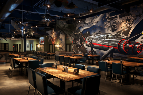 Hyper realistic photo, Interior view, 85mm focal length, A-Wings Army sports bar on a 1500 square foot double height space with wood beams, with murals in navy blue and military green, ships and airplanes, Tyler Walpole, bold outlines, dynamic lighting, lively tableaus, expressive use of line, cartoonish elements, polished concrete floor, The restaurant is a tribute to those who have served in the military, located in the area of Ocean Beach, San Diego, overcast, --ar 3:2