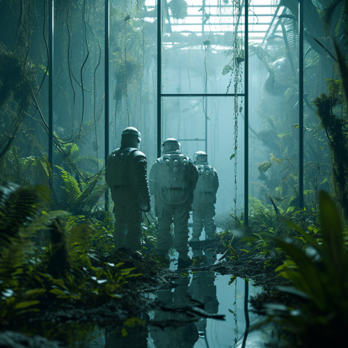A Ridley Scott Medium wide shot of three genetic biologists working together in hazmat suits standing in a Large glass floor to ceiling Cubicle Vivarium in a top secret high tech modern research lab filled with lush greenery and Alien like fungus plant half Portuguese man o' war, with a nervous system encased inside a gelatinous mass, Cellular slime mold, poisonous carnivorous sea anenome formations designed by Skink Chen, ultra realistic, Photography by Gregory Crewdson, dim lighting, atmospheric, photoreal, moody top down lighting, hyper realistic, 8k quality, octane render, art station, realistic high detail beautiful lighting, photoreal, cinematic, highly detailed, atmospheric, concept art, Vray, Gregory Crewdson --v 6.0 --s 250