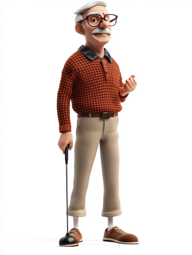 a full-body image of a 60-year-old male golfer in the 70s. His grooming, apparel, and equipment are over-the-top representations of period style and culture. He is facing camera left and sharing an observation with us. solid white background. style of pixar 3D animation. --ar 3:4