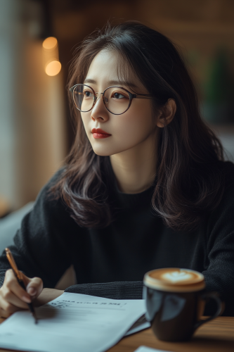 imagine A Korean female teacher, wearing glasses, sits in a Bauhaus-style coffee studio,papers and pens on the table. She is focused on grading assignments, with a beautifully crafted latte beside her. The rendering style is realistic,cinematic style, cool tone, still life photography, Fujifilm XT4 film style raw,natural light, retro style, soft focus effect. high resolution --ar 2:3 --v 6.1 --s 80