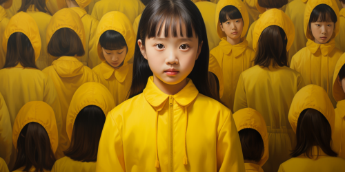 A group photo of a 6-year-old Korean girl in kindergarten. She is wearing a yellow uniform. realism, hyper reality, --ar 2:1
