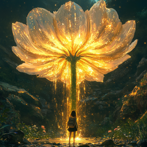 It's daytime. A girl with a backpack on stands under a massive magical beautiful flower with a tall green stem. The petals shimmers in the sun. The centre of the flower and petals is filled with golden liquid nectar that shimmers in the sun