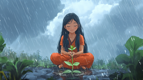 A 10-year-old Korean girl as a bodhisattva, with long black hair, in an oil painting style, kneeling with her knees bent and her arms resting comfortably on her thighs. She is smiling gently under a clear sky, looking contentedly at a single green sprout emerging from the rain-soaked earth in front of her. The scene conveys a sense of peace and tranquility, with a mystical, serene atmosphere, rich textured brushstrokes, and vibrant colors. --ar 16:9