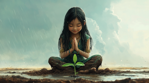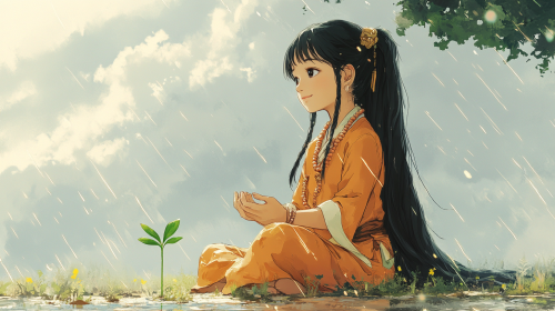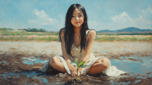 A 10-year-old Korean girl as a bodhisattva, with long black hair, in an oil painting style, sitting under a clear sky, with a gentle smile on her face. She has prayer beads on her wrist, kneeling down on rain-soaked earth where a single green sprout is emerging. The bodhisattva girl is looking at the sprout, capturing a sense of tranquility and wonder. The scene has a mystical, serene atmosphere, with rich, textured brushstrokes and vibrant colors. --ar 16:9