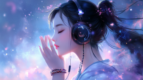 A dreamy, fairytale-like illustration of a 15-year-old Korean girl bodhisattva, shown in a side profile. She is deeply immersed in the music, wearing a modern headset over her ears, with both hands gently holding the headset. Her eyes are closed, and her expression is calm and focused. Her sleek, black hair flows softly in the breeze, styled in a trendy, youthful way. A string of prayer beads rests on one wrist. The background is a surreal, otherworldly scene with soft pastel colors blending into deep blues and purples, creating a mystical, dreamlike sky. Light particles and subtle glowing elements float around her, giving the scene a peaceful, healing energy. The atmosphere is magical and serene, inviting viewers to feel calm and inspired. 4k resolution, --ar 16:9