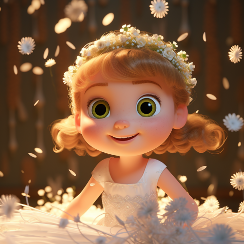 a cartoon baby girl 2 years old, light brown midlong hair, in baptism white dress, golden hair band, golden ribbon, surrounded by flowers, in the style of 8k 3d, concept art by Pixar, light amber and sky-blue, fine feather details, subtle use of shading