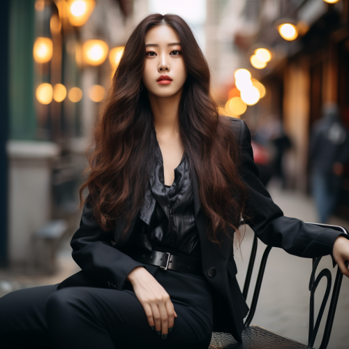 photo of a beautiful tall slim young korean female celebrity, long hair, wearing gloves, blazer, leggings, sitting, street photography