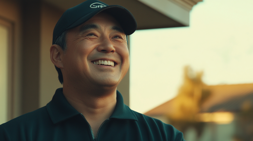 A mid-shot of a middle-aged South Korean man in his 40s, wearing golf attire and smiling, set in 2024, super realistic, UHD, future, Cinematic, Photography, Ultra - Wide Angle, Depth of Field, hyper - detailed, insane details, intricate details, beautifully color graded, Unreal Engine 5, Cinematic, Photoshoot, Shot on 25mm lens, Depth of Field, DOF, Tilt Blur, Shutter Speed 1/ 1000, F/ 22, White Balance, 32k, Super - Resolution, Megapixel, Pro Photo RGB, VR, Good, Massive, Half rear Lighting, Backlight, Natural Lighting, Incandescent, Optical Fiber, Moody Lighting, Cinematic Lighting, Studio Lighting, Soft Lighting, Volumetric, Conte - Jour, Beautiful Lighting, Accent Lighting, Global Illumination, Screen Space Global Illumination, Ray Tracing Global Illumination, Optics, Scattering, Glowing, Shadows, Rough, Shimmering, Ray Tracing Reflections, Lumen Reflections, Screen Space Reflections, Diffraction Grading, Chromatic Aberration, GB Displacement, Scan Lines, Ray Traced, Ray Tracing Ambient Occlusion, Anti - Aliasing, FKAA, TXAA, RTX, SSAO, Shaders, OpenGL - Shaders, GLSL - Shaders, Post Processing, Post - Production, Cell Shading, Tone Mapping, CGI, VFX, SFX, insanely detailed and intricate, hyper maximalist, elegant, super detailed, dynamic pose, photography, volumetric, ultra - detailed, intricate details, 8K, super detailed, ambient occlusion, volumetric lighting, high contrast, HDR, 8k --ar 16:9