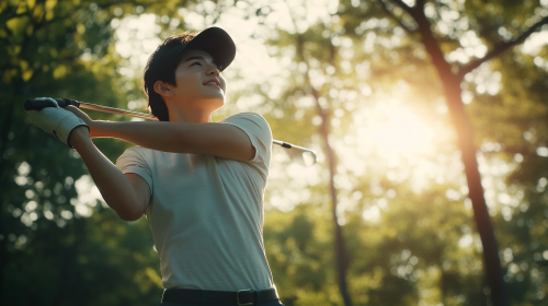 A young and handsome man in his 20s or 30s from South Korea who has just started playing golf, super realistic, UHD, future, Cinematic, Photography, Ultra - Wide Angle, Depth of Field, hyper - detailed, insane details, intricate details, beautifully color graded, Unreal Engine 5, Cinematic, Photoshoot, Shot on 25mm lens, Depth of Field, DOF, Tilt Blur, Shutter Speed 1/ 1000, F/ 22, White Balance, 32k, Super - Resolution, Megapixel, Pro Photo RGB, VR, Good, Massive, Half rear Lighting, Backlight, Natural Lighting, Incandescent, Optical Fiber, Moody Lighting, Cinematic Lighting, Studio Lighting, Soft Lighting, Volumetric, Conte - Jour, Beautiful Lighting, Accent Lighting, Global Illumination, Screen Space Global Illumination, Ray Tracing Global Illumination, Optics, Scattering, Glowing, Shadows, Rough, Shimmering, Ray Tracing Reflections, Lumen Reflections, Screen Space Reflections, Diffraction Grading, Chromatic Aberration, GB Displacement, Scan Lines, Ray Traced, Ray Tracing Ambient Occlusion, Anti - Aliasing, FKAA, TXAA, RTX, SSAO, Shaders, OpenGL - Shaders, GLSL - Shaders, Post Processing, Post - Production, Cell Shading, Tone Mapping, CGI, VFX, SFX, insanely detailed and intricate, hyper maximalist, elegant, super detailed, dynamic pose, photography, volumetric, ultra - detailed, intricate details, 8K, super detailed, ambient occlusion, volumetric lighting, high contrast, HDR, 8k --ar 16:9