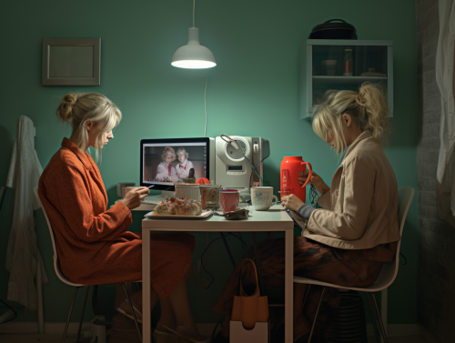 photographic, home office, two women, drinking coffee, working on computer --ar 4:3