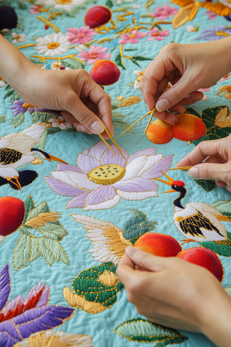 Korean traditional embroidery craft, Several hands are making a lotus shape., plums, peaches and cranes on the background, bright colors, Gold thread is used, Korean traditional style, skyblue background color, gorgeous background, A background embroidered with colorful traditional style flowers, greg rutkowski --no letters --ar 2:3