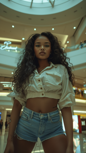 A dynamic low-angle shot of a confident woman in a mall, wearing tight denim shorts and a form-fitting shirt that accentuates her figure. Her long, voluminous, curly black hair cascades down as she steps forward, as if stomping on the camera, her bronzed skin glowing under the bright mall lights. Her intense green eyes and full lips are visible, framed by thick, well-defined eyebrows. The background features modern mall architecture, with bright displays and shoppers in the distance, blurred to keep the focus on her. The lighting is vibrant, with a high-contrast effect that highlights her dominance and presence in the scene. Created Using: ultra-wide lens, vivid color palette, high-definition, fashion photography techniques, dynamic perspective, cinematic lighting, street-style influence, digital enhancement --ar 9:16 --v 6.0