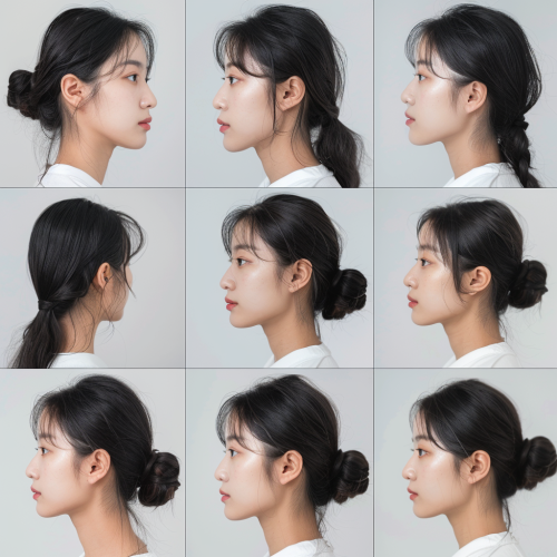 3x3 grid layout, Single portrait of a young Korean woman, age 20, showcasing 9 diverse facial angles. Each grid cell contains a different angle: Front-facing shot Left profile Right profile 3/4 view from the left 3/4 view from the right Looking up shot Looking down shot Slightly tilted head shot Over-the-shoulder shot Consistent lighting and neutral background across all images for cohesion. Ultra-detailed capture using Sony Alpha 1 with Canon RF 85mm f/1.2L lens. Rembrandf ighting for dramatic shadow play, adapting to each angle. Shot at ISO 100 for maximum clarity. Vivid color saturation and lifelike skin tones. Composition inspired by Annie Leibovitz's multi-angle portraits, emphasizing the subject's facial structure and features from various perspectives --style raw --v 6.0