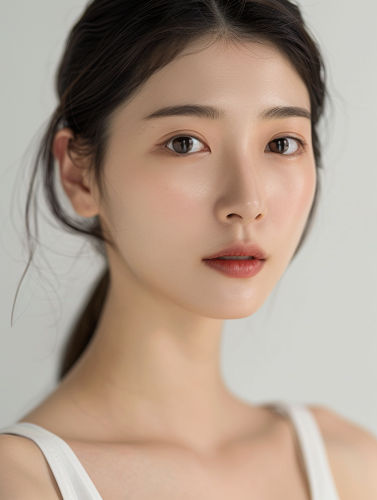 A hyper-realistic close-up portrait of a young Korean woman with flawless, smooth skin, standing in front of a serene beach with soft waves and a clear blue sky. Her face is illuminated by gentle, natural sunlight, creating a subtle, radiant glow on her skin. She has slightly almond-shaped eyes with a calm and soft expression, and her lips are naturally full with a hint of a gentle smile, giving her a warm, approachable look. Her long, dark brown hair is styled smoothly and tucked behind her ears, allowing her face to be fully visible, with a few strands adding a casual elegance. She is wearing a minimalist white sleeveless top with thin straps, emphasizing her clean, sophisticated style. The background captures a blurred, sunlit beach scene with a pale blue sky, white sand, and the ocean’s horizon, adding a refreshing and summery atmosphere to the image. The lighting is soft yet bright, highlighting her skin’s natural texture and giving the scene a warm, sun-kissed effect. There’s a slight breeze that gives her hair a natural flow, enhancing the relaxed and effortless feel of the portrait. Ultra-high-definition quality, capturing every delicate detail with photorealistic precision, creating a tranquil and elegant beachside portrait --ar 3:4 --v 6.0