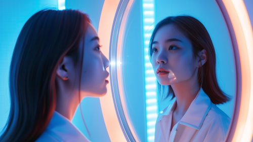 Capture a real photograph of a Korean teenage girl gazing into a mirror with built-in LED lights in a rounded design, examining her reflection. Craft the image to showcase the futuristic and modern atmosphere. Photography, --ar 16:9