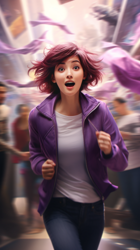 scene from Korean drama, attractive Korean woman with a purple bob haircut smiling and running at the camera like she is running at the love of her life, soft lighting, scene is in a museum --ar 9:16