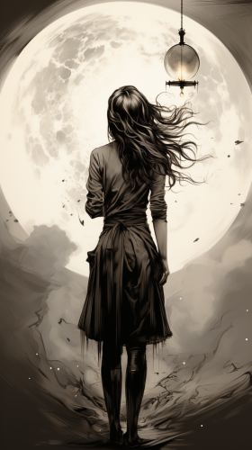 classic drawing line art illustration, black and white, maiden in sun dress, female, long hair, looking up at an orb of light, graceful, elegant --ar 9:16 --s 750 --v 5.2
